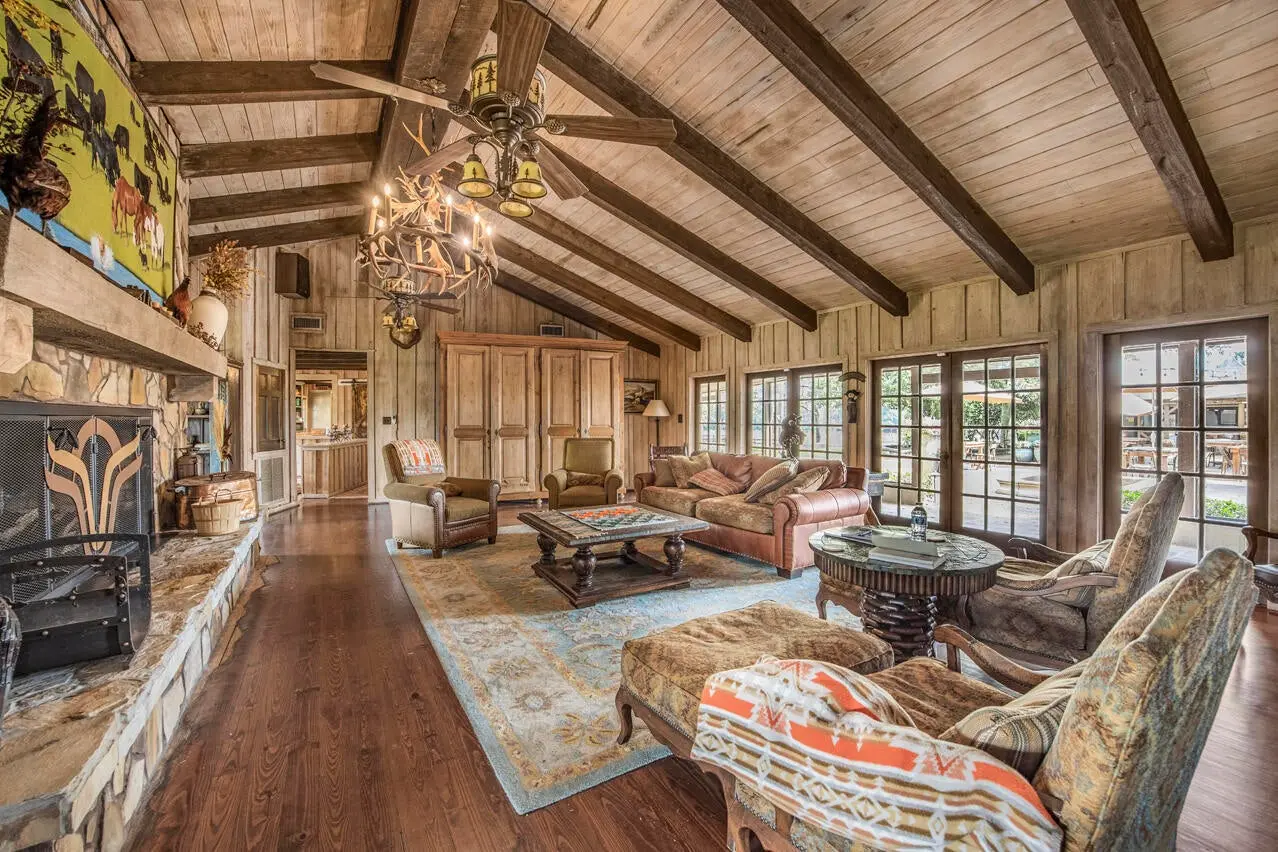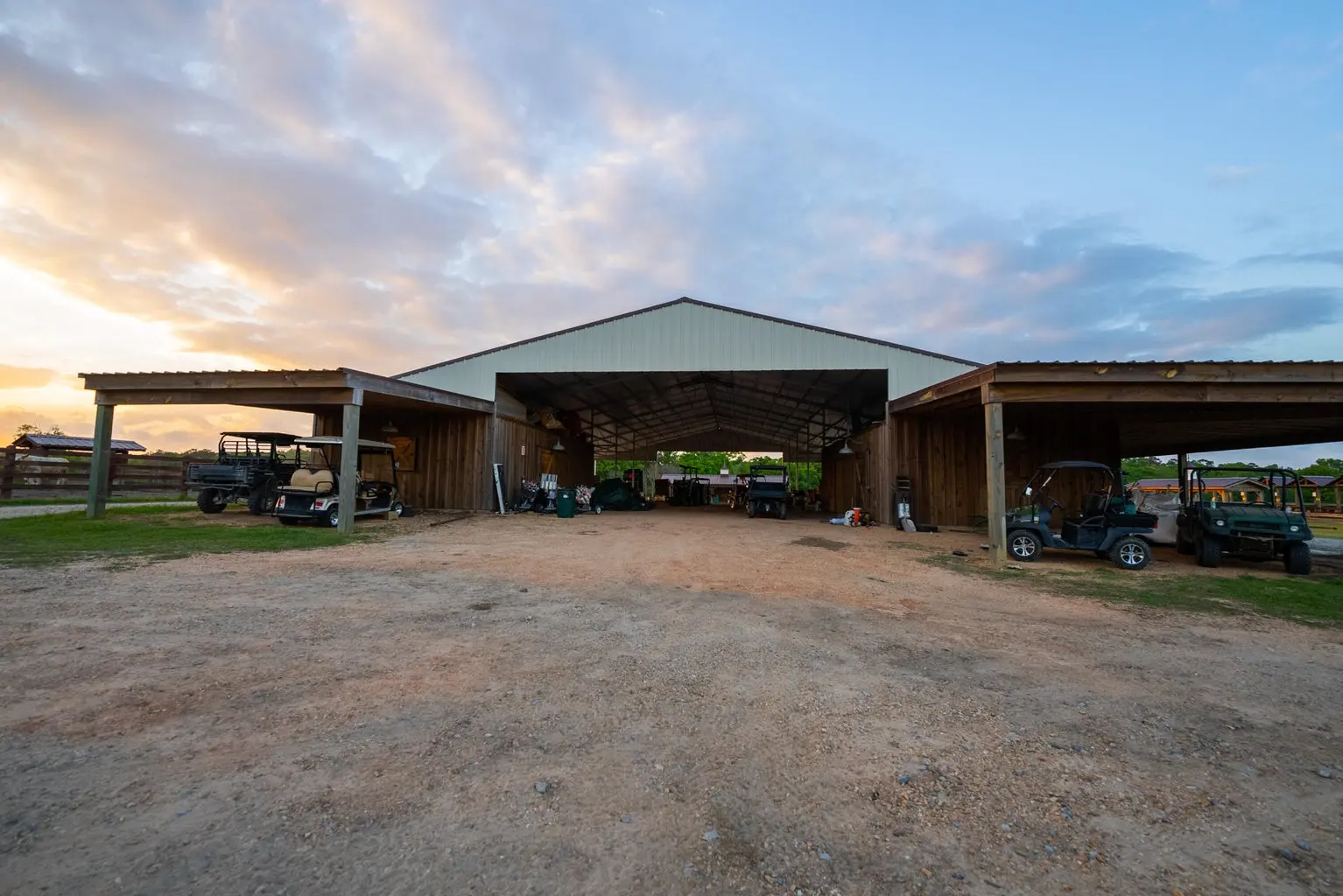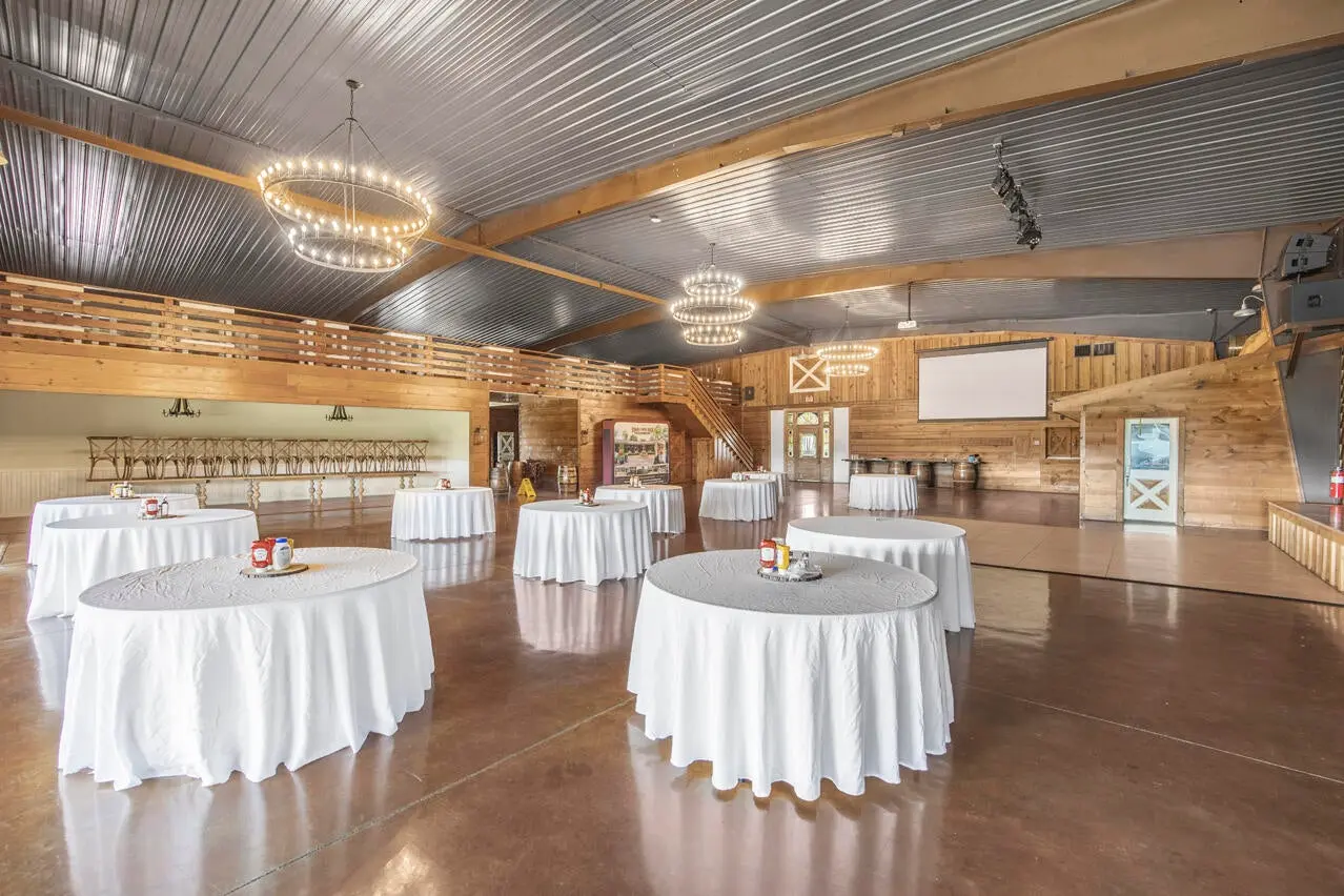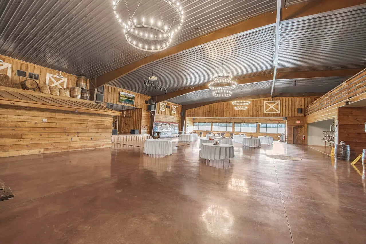 A soaring stone fireplace, elevated bar, and beautifully appointed guest suites make it equally suited for private family use, executive retreats, or hosted sporting gatherings. Just beyond, a stunning veranda features a commercial kitchen, flag stone fire pit, and sweeping countryside views — the perfect setting for entertaining clients, guests, or event attendees. What truly sets Running Creek Ranch apart is its 17,300 SF multi-million-dollar facility known as The Stables. Until recently, it was operated as an event venue accommodating up to 260 seated guests. It has a complete commercial kitchen and the ability to provide a significant built-in revenue stream through weddings, corporate events, and private functions. For the rancher focused on horses, the structure can be converted back into a premier equestrian facility with minimal investment — returning it to its original purpose as the operational hub of the ranch.