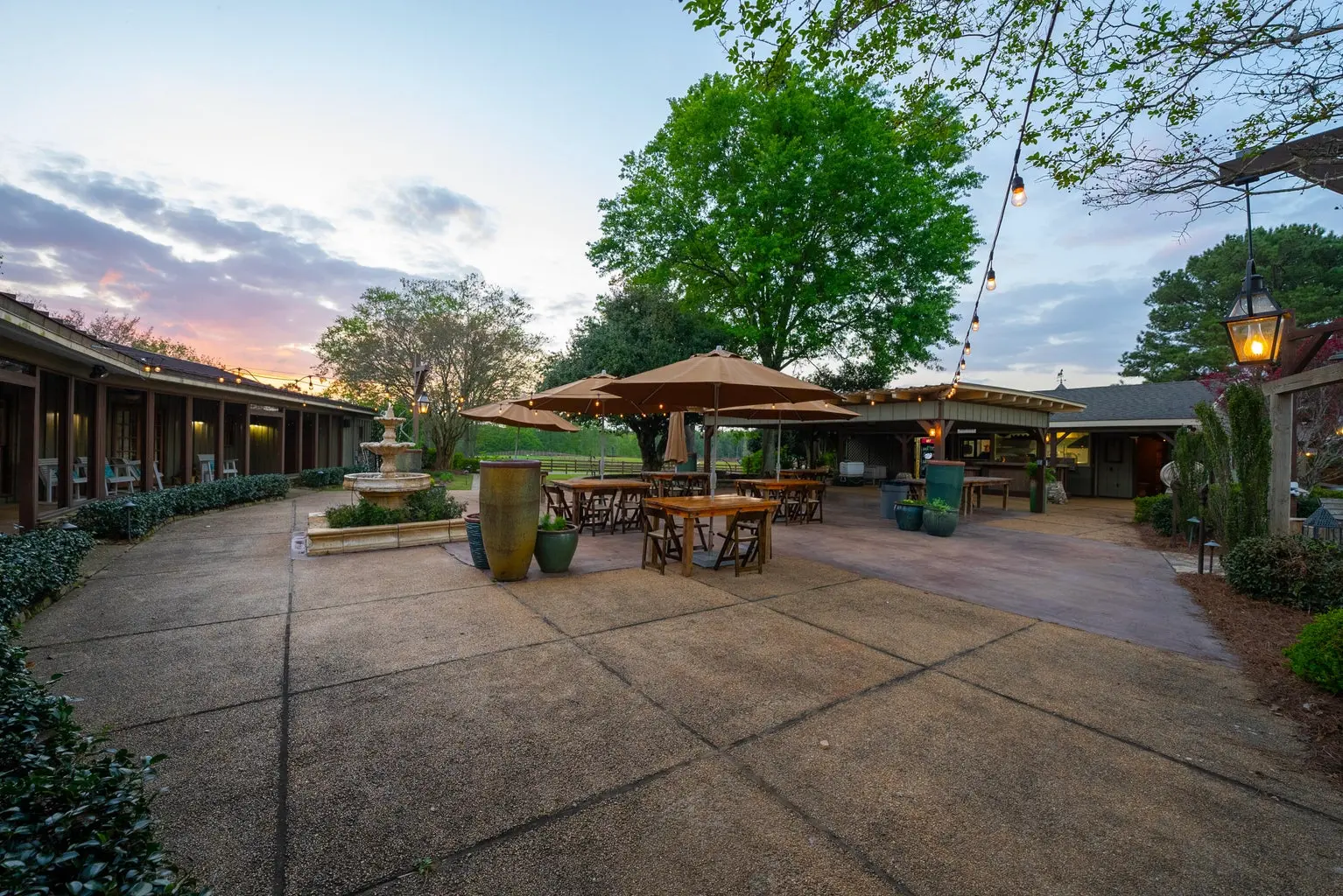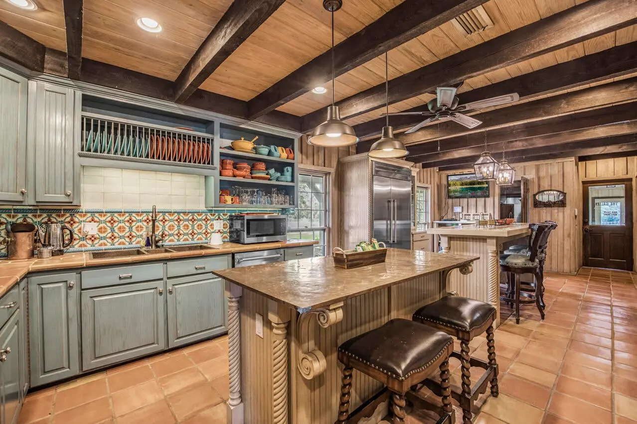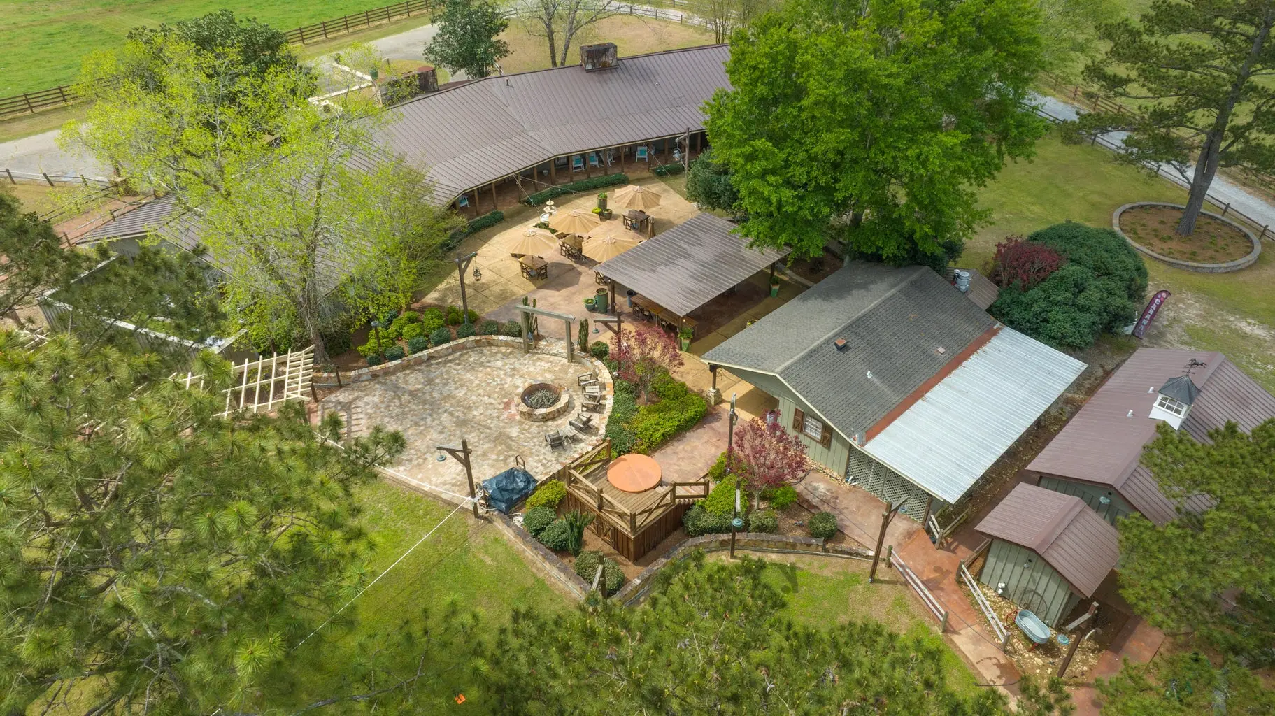 A soaring stone fireplace, elevated bar, and beautifully appointed guest suites make it equally suited for private family use, executive retreats, or hosted sporting gatherings. Just beyond, a stunning veranda features a commercial kitchen, flag stone fire pit, and sweeping countryside views — the perfect setting for entertaining clients, guests, or event attendees. What truly sets Running Creek Ranch apart is its 17,300 SF multi-million-dollar facility known as The Stables. Until recently, it was operated as an event venue accommodating up to 260 seated guests. It has a complete commercial kitchen and the ability to provide a significant built-in revenue stream through weddings, corporate events, and private functions. For the rancher focused on horses, the structure can be converted back into a premier equestrian facility with minimal investment — returning it to its original purpose as the operational hub of the ranch.