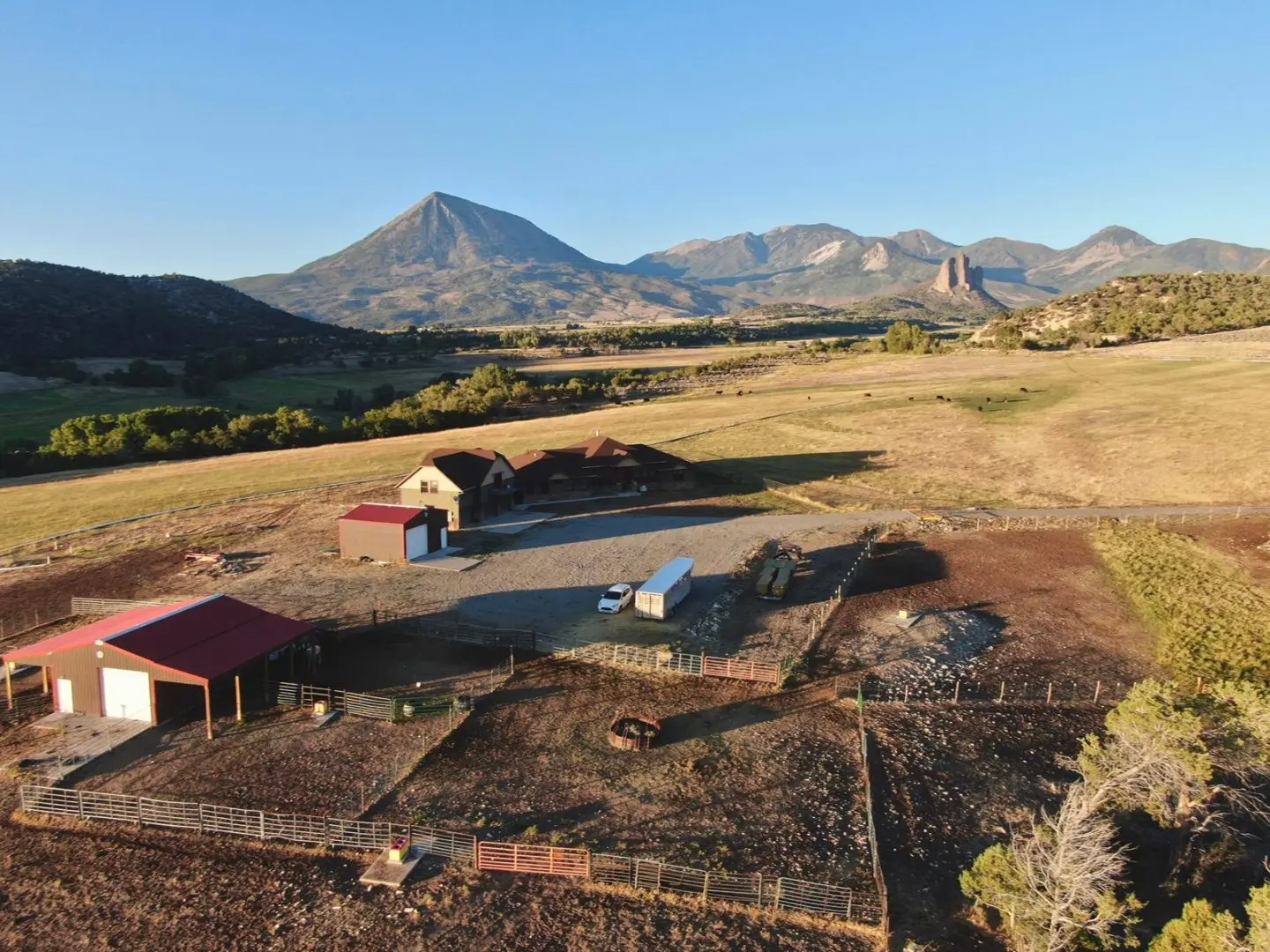 The ranch has a total of 142 acres, approximately 70 of which are irrigated hay meadows. The balance is a pleasing mixture of draws, woods, and sub-irrigated meadows that make for excellent horse pastures. Irrigation water is provided by the Daisy Ditch as well as 75 shares of Smith Fork Project water, and water is delivered primarily by gated pipe. Domestic water is provided by the Deutsch Domestic Water Company. Most of the fences on the property are new, with good pipe fence surrounding the ranch home. The views from the property are simply some of the best in all of Colorado, with stunning vistas of the West Elk Mountains and Needle Rock. Several of the horse pastures have frost-free horse waterers extended to them. A spring-fed pond on the property stays consistently full.