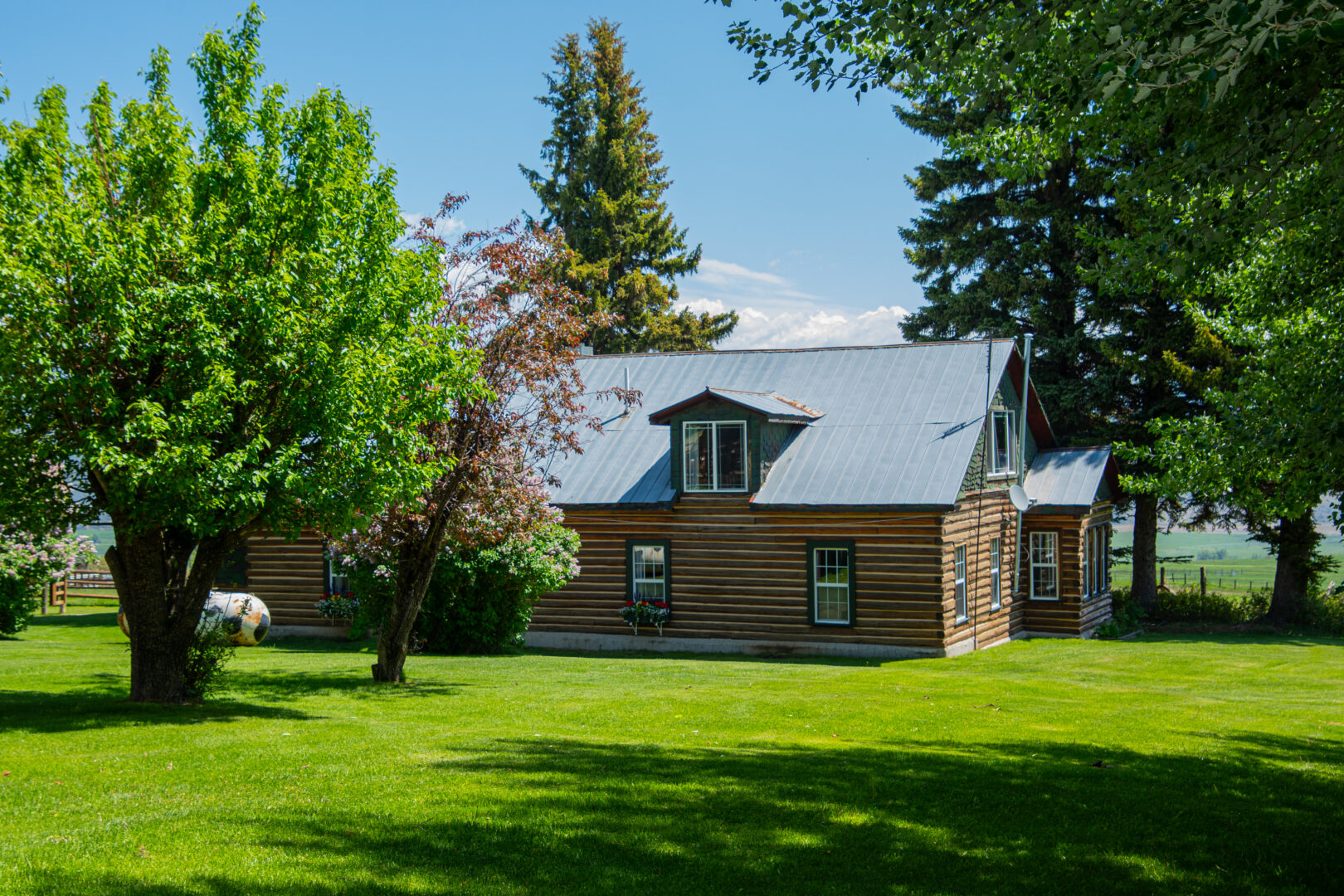 With its homesteading patent date clear back in the late 1880’s, the Gates Ranch has a long history reflected by common-sense useful improvements. The original ranch house now serves as a bunkhouse during hunting season. With a spacious 3,039 square feet, it has 3 bedrooms and a bath downstairs, three bedrooms and one bath upstairs and can sleep up to 12. It is rustic and cozy, with a large country kitchen and an enclosed porch decorated by old cowboy hats and ropes. The interior is warm and inviting and furnished with ranch-appropriate décor. Also a log home, the main house is smaller at 1,158 square feet, with three bedrooms and one bath. There are several outbuildings, including two recent metal shop buildings, as well as corrals and loading chutes.