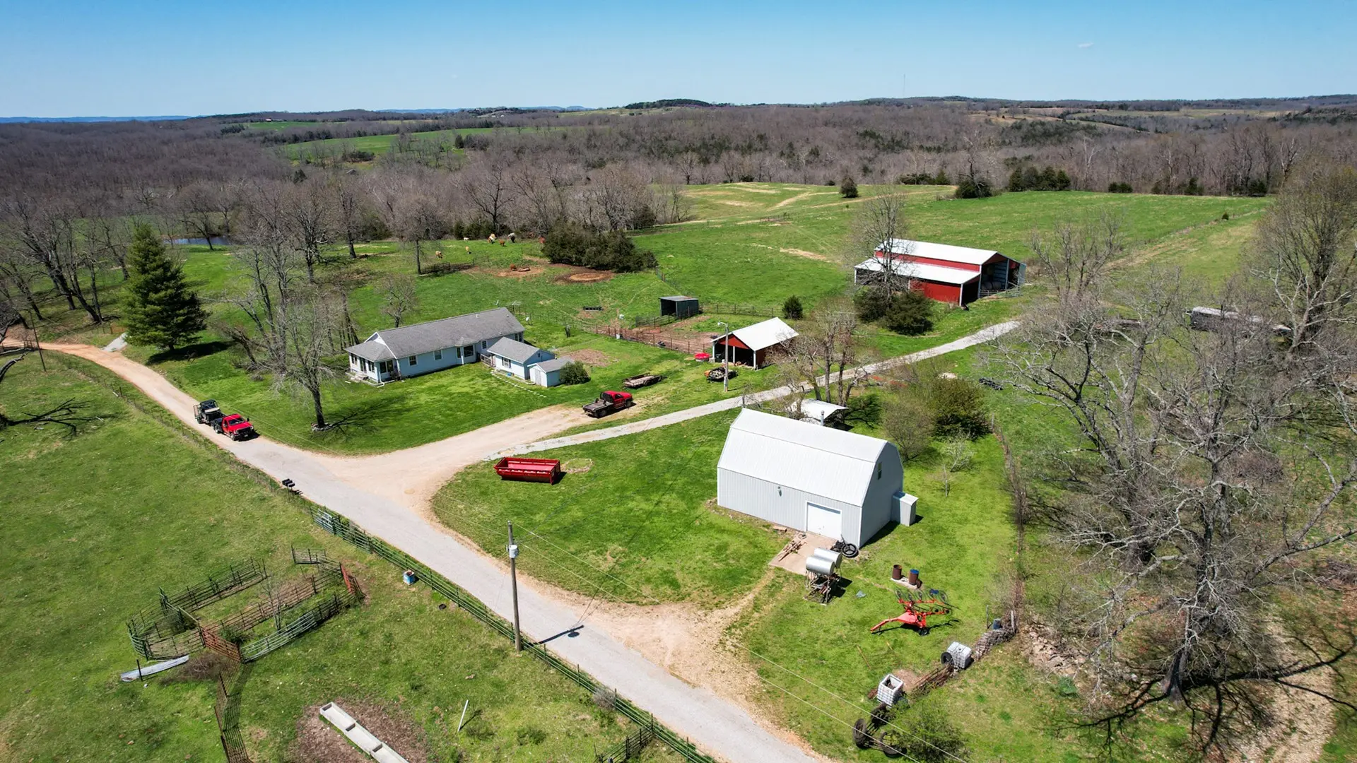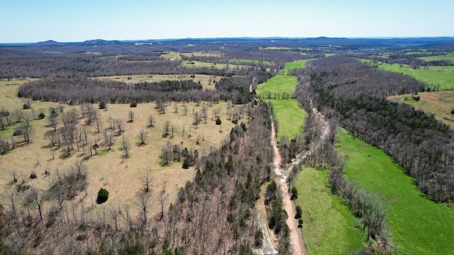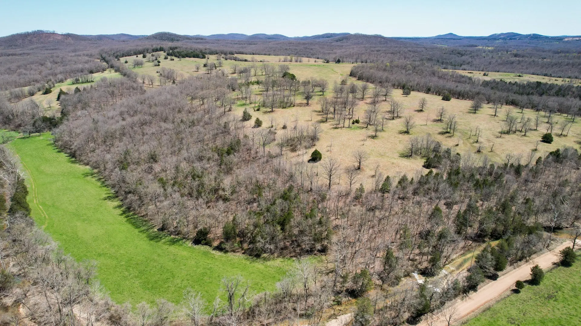 This large ranch for sale is located in the Ozark Mountains of Ozark County, Missouri. There are 1,124 acres known as ‘Timberknobs Ranch’ – 500 of these acres is pasture land, and 600+ acres is wooded. One mile of this property joins the Caney Mountain Game Refuge which is Missouri Conservation land. This piece of land has amazing features including gravel road frontage, year-round creek, 2 large springs, many smaller springs, 10 ponds, 9 separated pastures used for rotating grazing, excellent fencing, 60 acres of bottom land and hay ground & more! The pasture land fencing has steel posts and 5 barbs with metal corners. The bottom land has the creek flowing along the edge. There are several trails through the wooded areas, some commercial sized timber, and a large spring fed pond. This is some of the best hunting land in the state & could be right out your back door! The property has a nice 3 bed, 2 bath home with many out buildings. It’s not fancy but a nice farmhouse. A second house called ‘the hunting cabin’ features 2 bedrooms, 1 bath and is in good condition as well. It has some remodeling including a new roof, front porch, vinyl siding and more. This ranch has been in the same family for over 100 years! It is considered a century farm. There is a current tenant that lives in the main house and leases the land. He would be willing to continue in that capacity. This is a rare opportunity to own acreage of this size with as many amenities for less than $2250 per acre. Taxes are only $1 per acre per year. This is a private setting only 1 mile from a paved road, 8 miles to Gainesville & 25 miles to Ava. This is great for cattle, or a hunting retreat. Investors could turn this into a hunting reserve as the wildlife is already there and the wooded area joins over 6000 acres of the game reserve. The only access to the reserve is private joining land or the main entrance is 25 miles away. Seldom does a property like this hit the market!