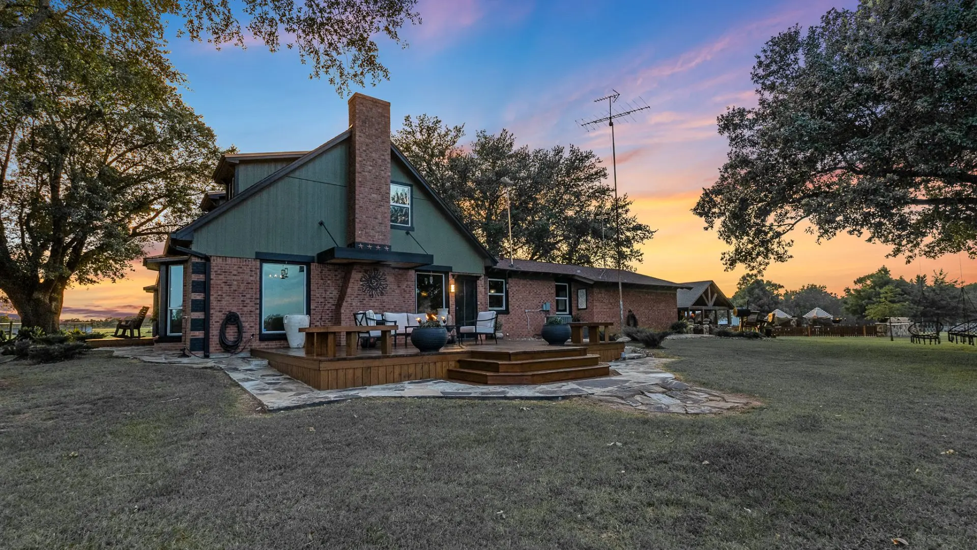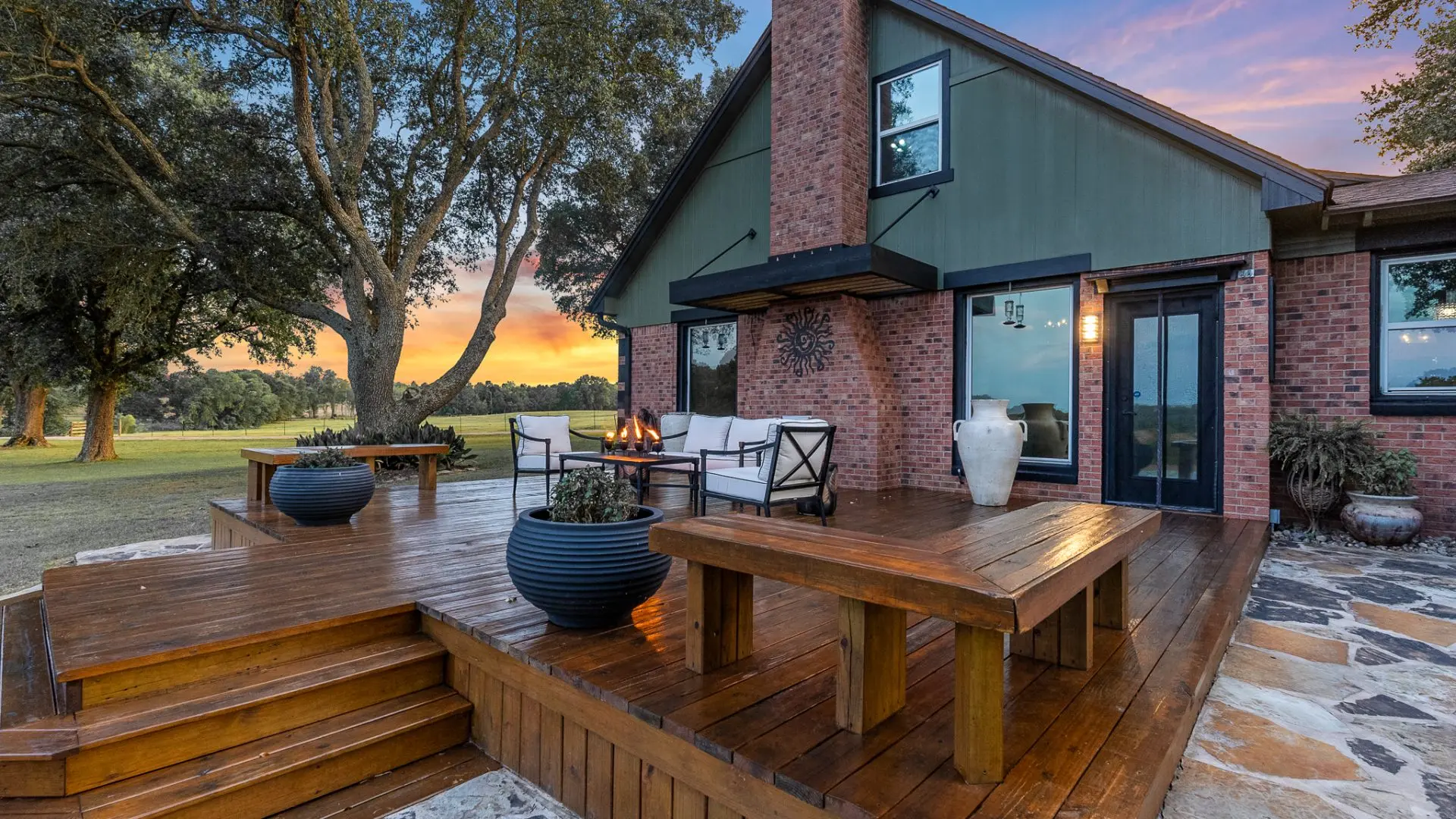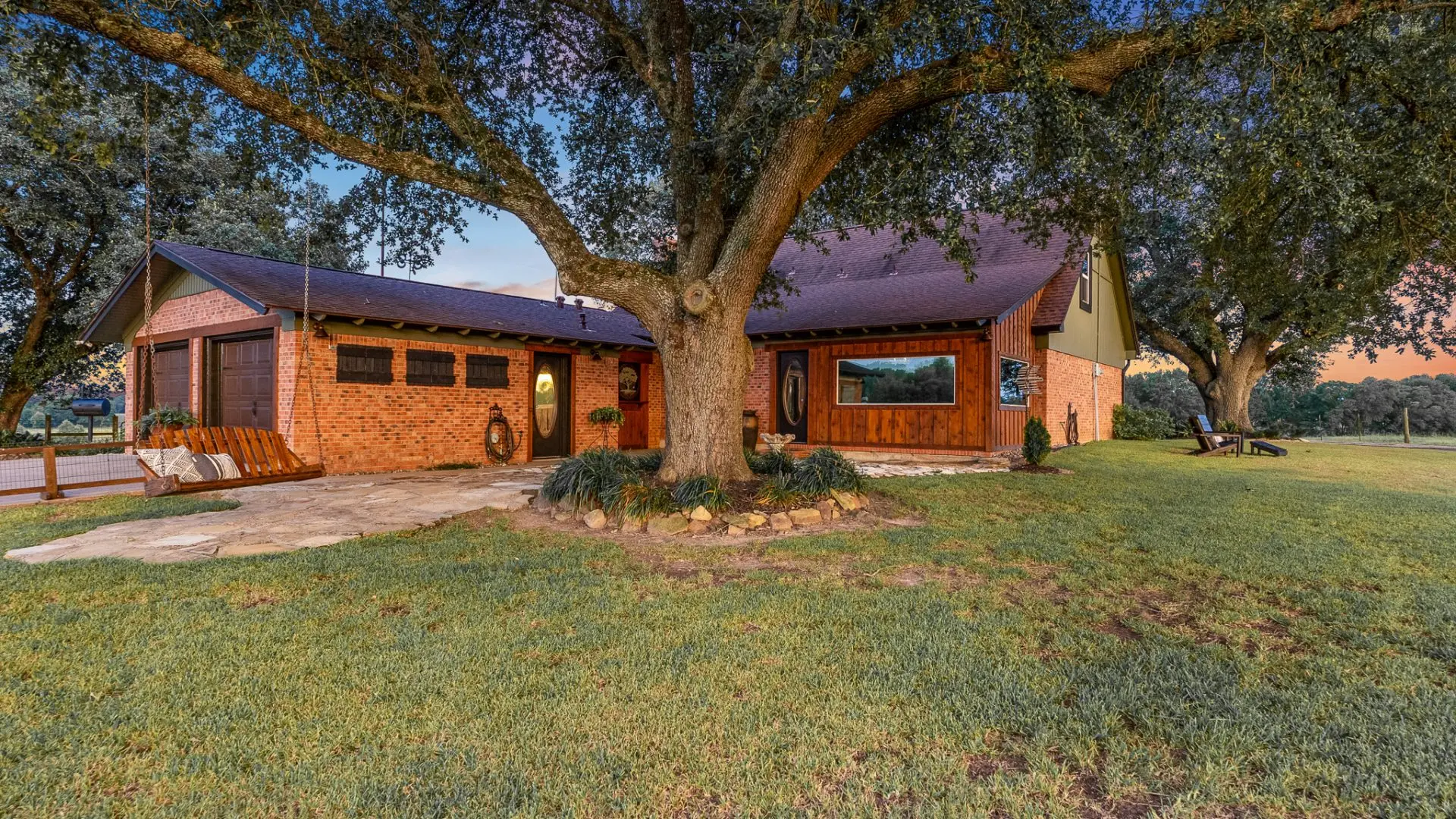 The property’s crown jewel is a 3,186-square-foot, two-story ranch home, strategically positioned on a hilltop for commanding views of the entire operation. Surrounded by massive ancient oak trees, this residence combines cowboy luxe with modern comfort.