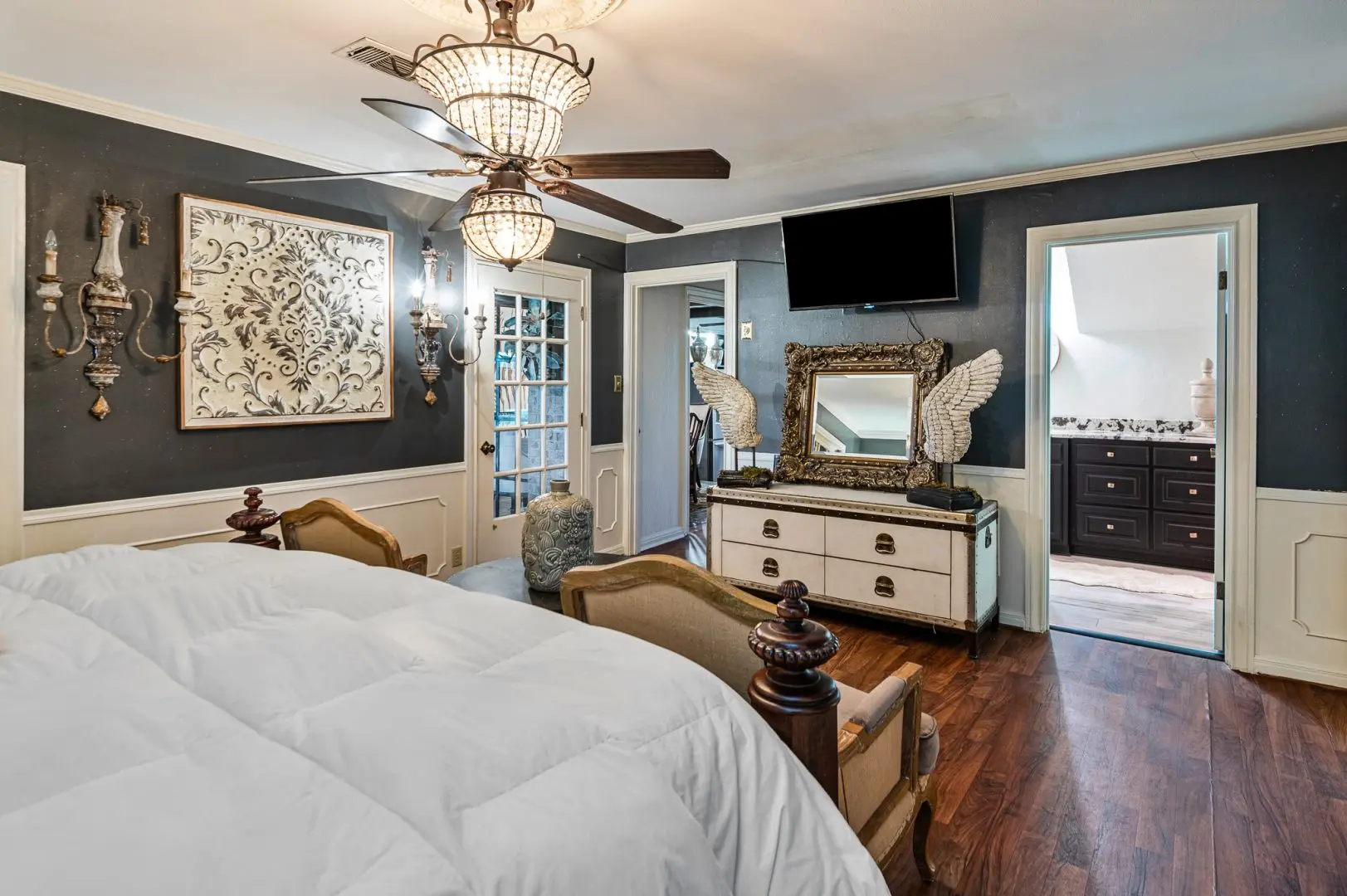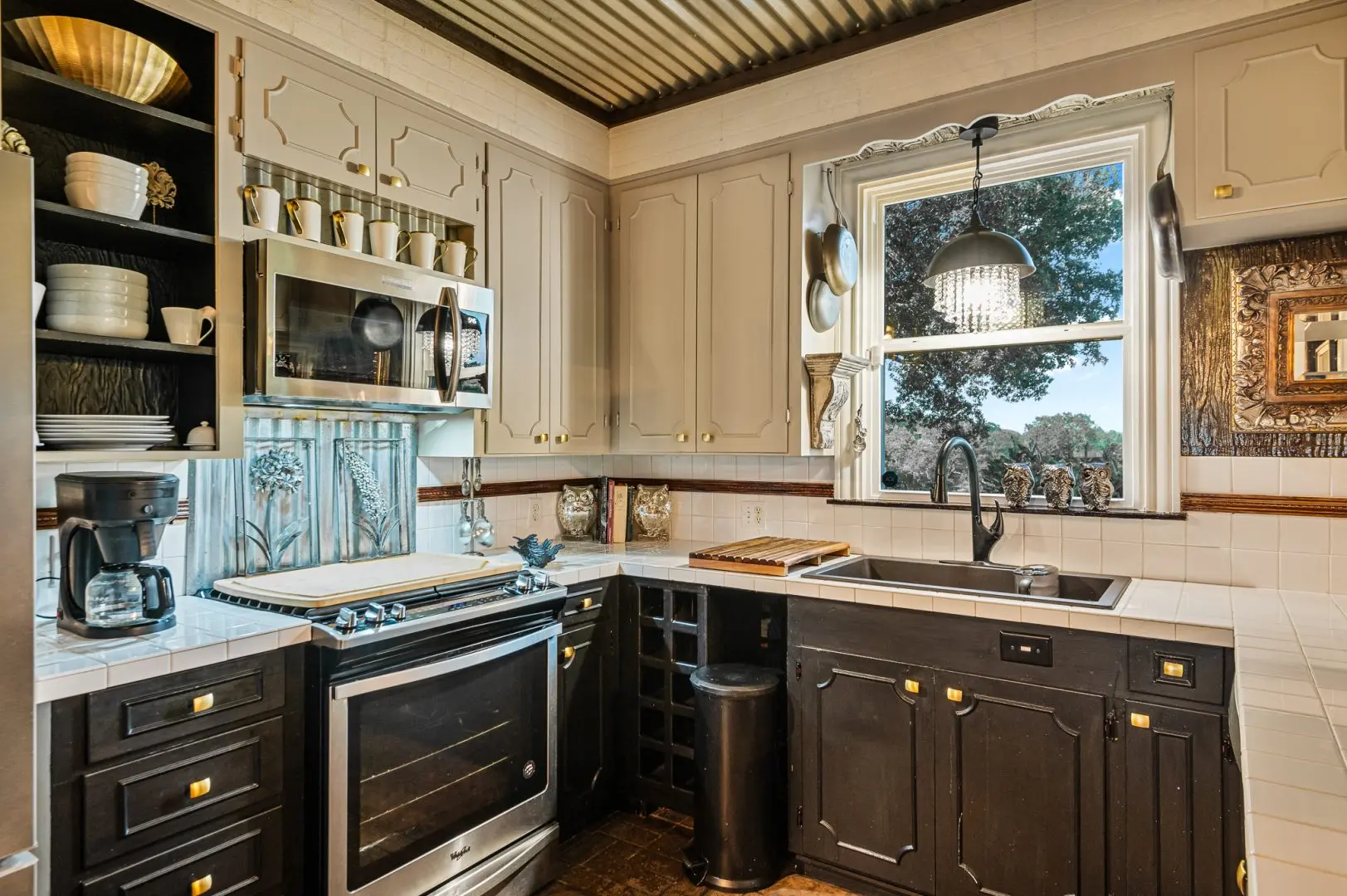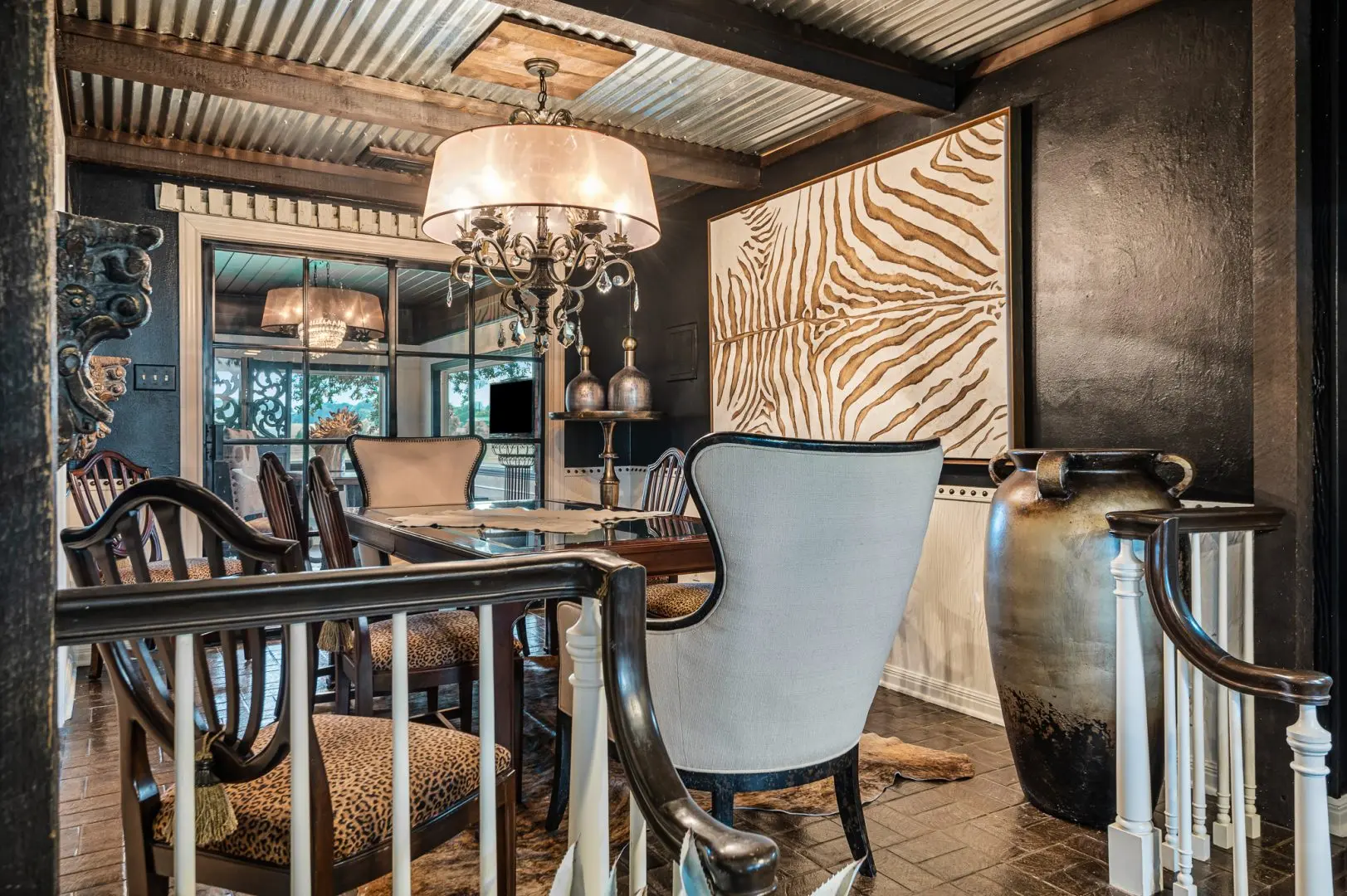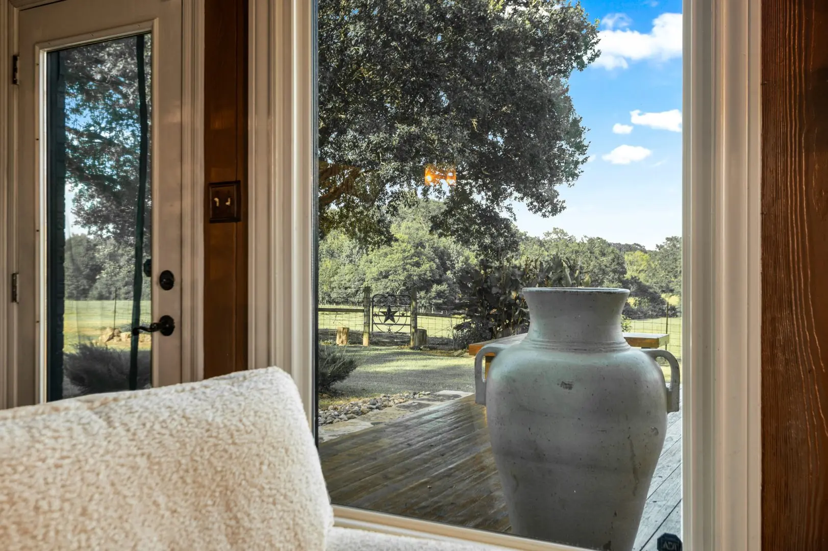 The property’s crown jewel is a 3,186-square-foot, two-story ranch home, strategically positioned on a hilltop for commanding views of the entire operation. Surrounded by massive ancient oak trees, this residence combines cowboy luxe with modern comfort.