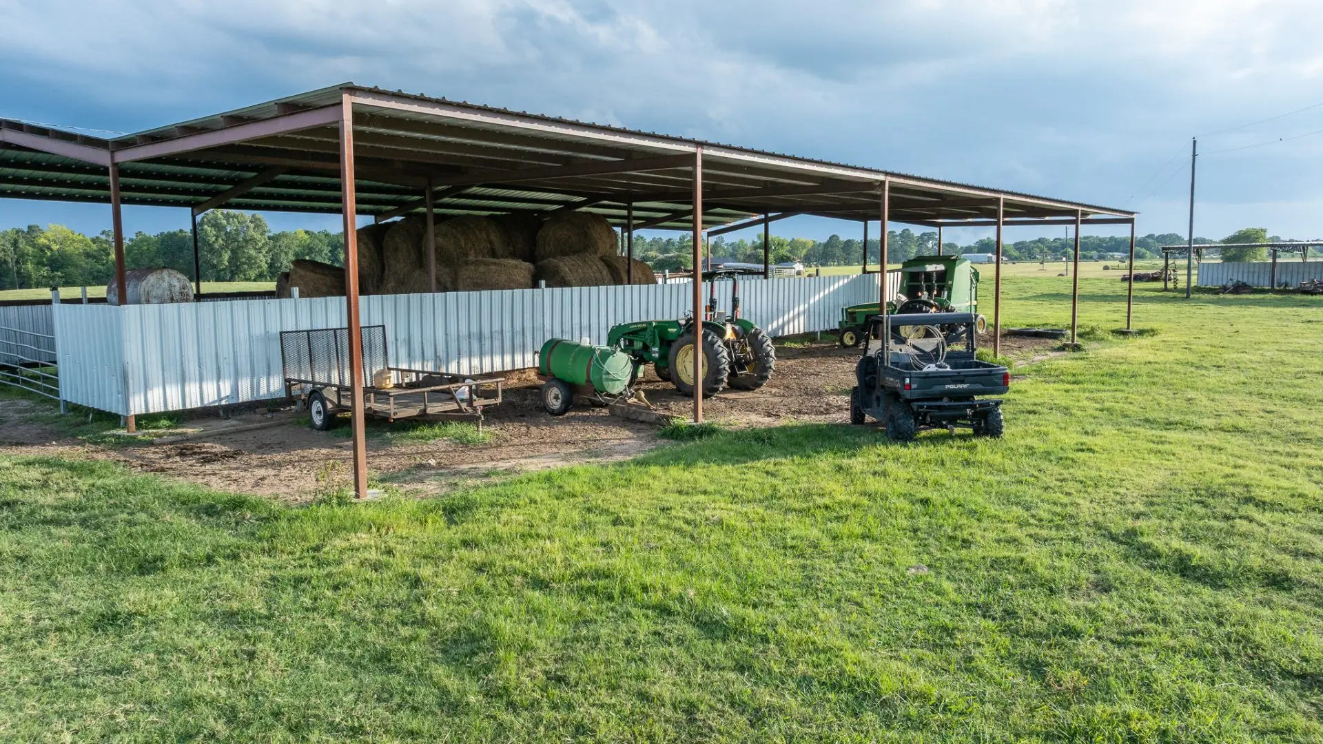 Behind the main residence, a metal shop building doubles as a man cave, providing versatile space for hobbies, projects, or recreational activities. The covered parking and storage areas protect valuable equipment investments from East Texas weather while offering flexible spaces that can adapt to various needs, whether for business operations, additional storage, or pursuing personal interests and crafts.