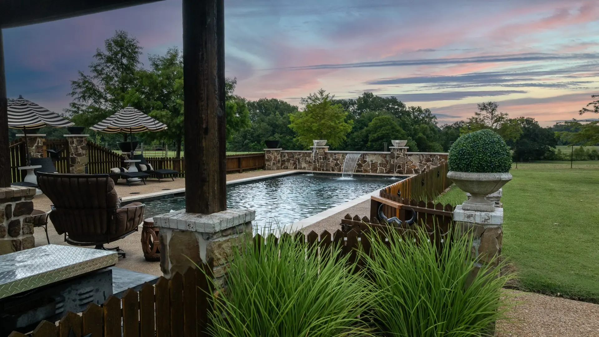What sets Triple C Ranch apart is its spectacular outdoor entertainment area, which rivals that of high-end resorts. The centerpiece is a professional-grade gunite saltwater pool featuring flowing water features and beautiful underwater lighting that transforms evening entertainment into magical experiences. Adjacent to the pool, an elegant stone and rough cedar cabana provides the perfect setting for relaxation and hosting guests.