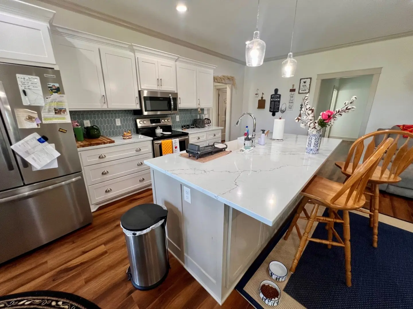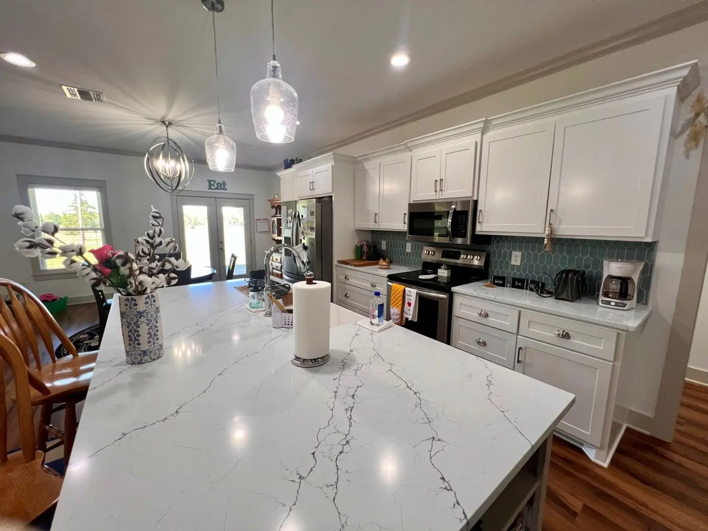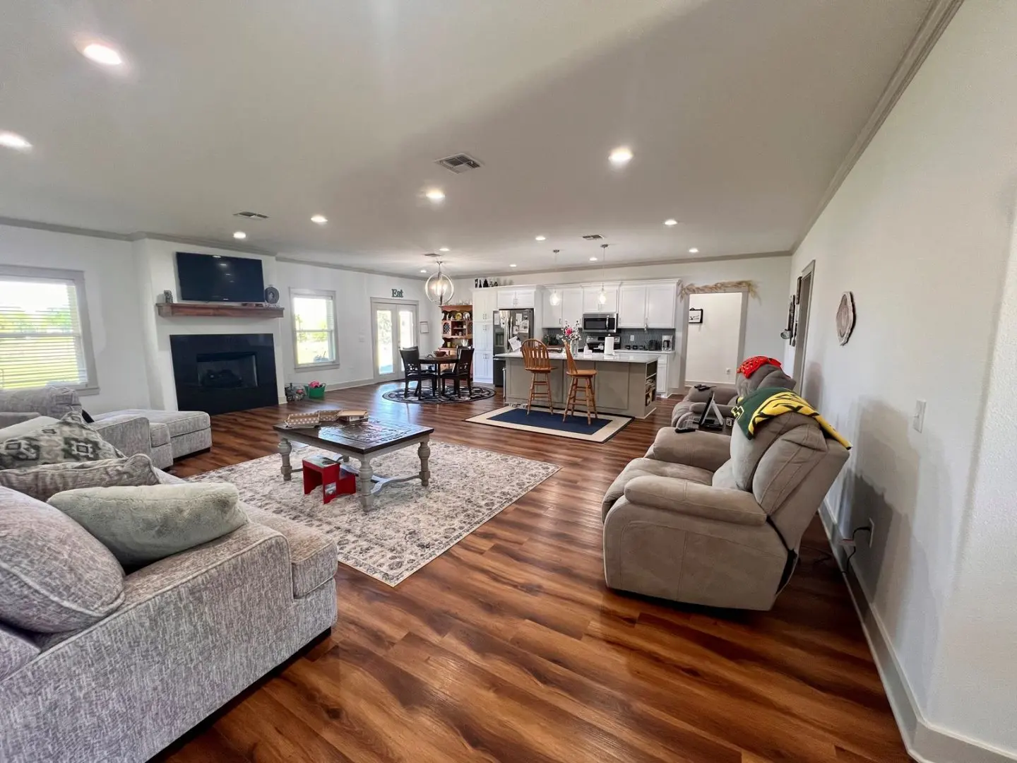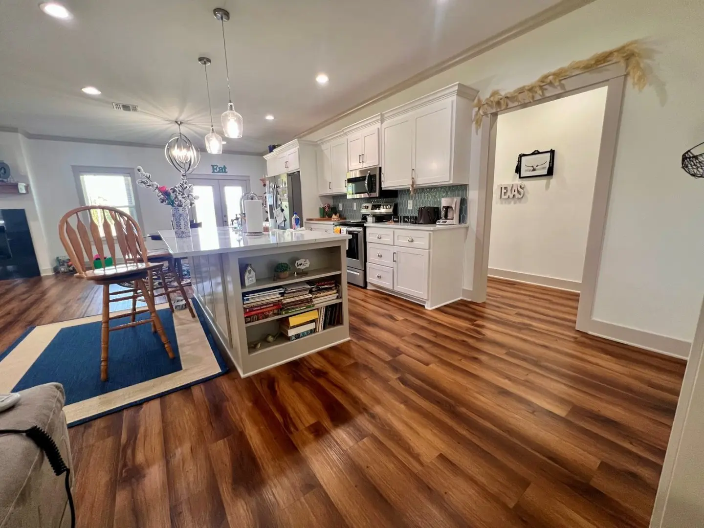 Step inside to discover a thoughtfully designed interior boasting high ceilings, ceiling fans, and an open concept floor plan that seamlessly connects the living, dining, and kitchen areas.
